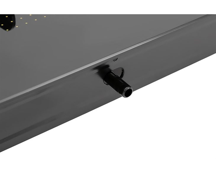 Mặt bếp gas bằng kính màu đen sang trọng, được bao quanh bởi viền inox bền chắc, dễ dàng vệ sinh, cho bếp mới lâu