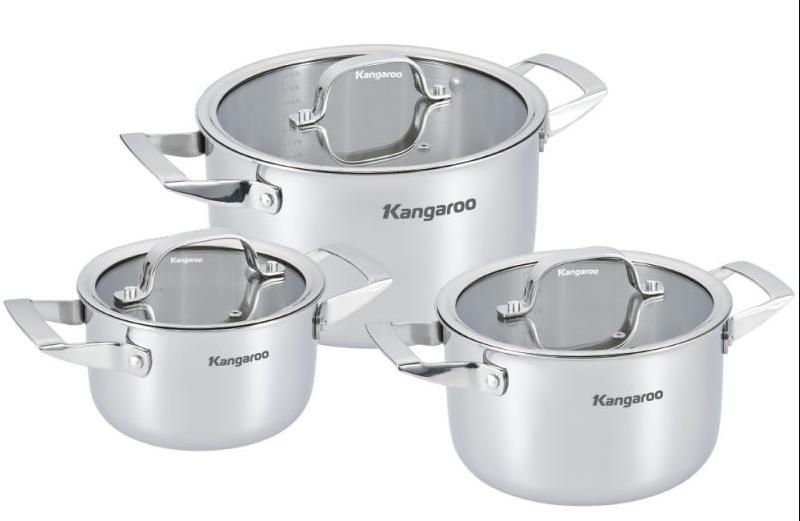Bộ nồi inox cao cấp Kangaroo KG304IP2 có ba kích cỡ là 16cm, 20cm, 24cm sử dụng thân và đáy 3 lớp, truyền giữ nhiệt tốt sẽ là lựa chọn hoàn hảo với nhu cầu nấu nướng của mọi gia đình.