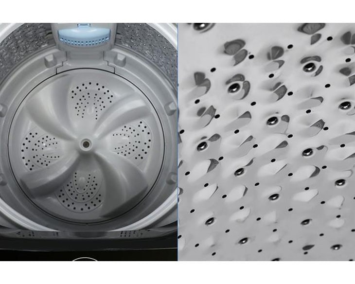Lồng giặt bên trong máy có các gờ nổi hình ngôi sao hỗ trợ giảm ma sát trực tiếp với quần áo, đồng thời tạo nhiều điểm tiếp xúc để giặt sạch hiệu quả hơn mà vẫn bảo vệ sợi vải.