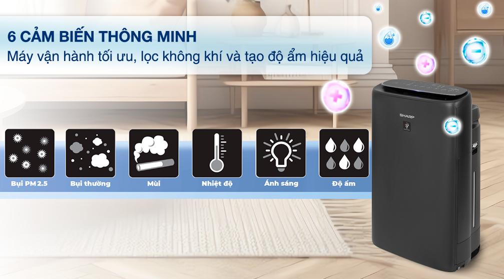 – 6 cảm biến thông minh gồm: bụi mịn PM2.5, bụi thường, mùi, nhiệt độ, ánh sáng, độ ẩm giúp máy vận hành tối ưu, lọc không khí và tạo độ ẩm hiệu quả.