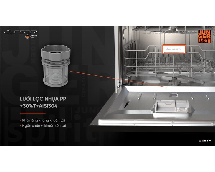 Tính năng rửa thông minh bằng công nghệ trí tuệ nhân tạo “Junger Super AI Cleaning” có thể tự động nhận diện độ bẩn của vật dụng và tự điều chỉnh thời gian và lượng nước rửa phù hợp cho từng mức độ bẩn của bát đĩa, giúp tiết kiệm điện năng, thời gian và lượng nước đến 30% so với các chương trình khác.