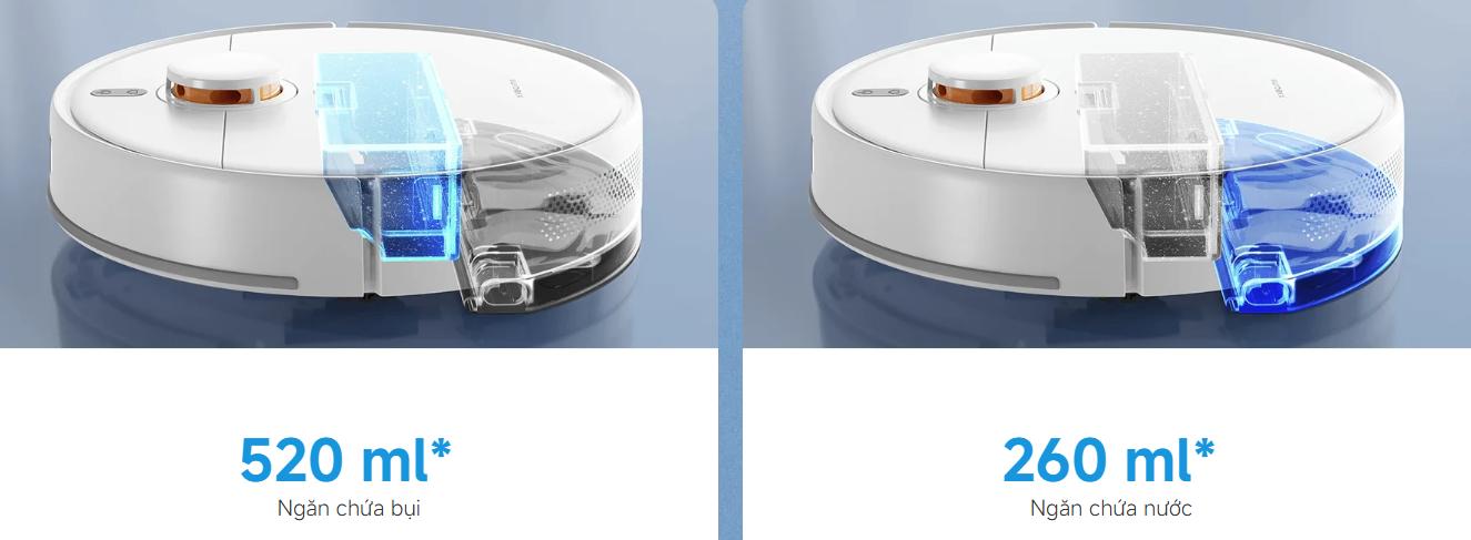 – Khoang chứa bụi có dung tích 520 ml, giúp chứa được nhiều bụi bẩn mà không cần phải đổ thường xuyên. Bên cạnh đó, robot còn tích hợp hộp chứa nước 260 ml, đảm bảo sàn nhà được lau sạch mà vẫn giữ độ ẩm phù hợp, tránh gây hư hỏng bề mặt.