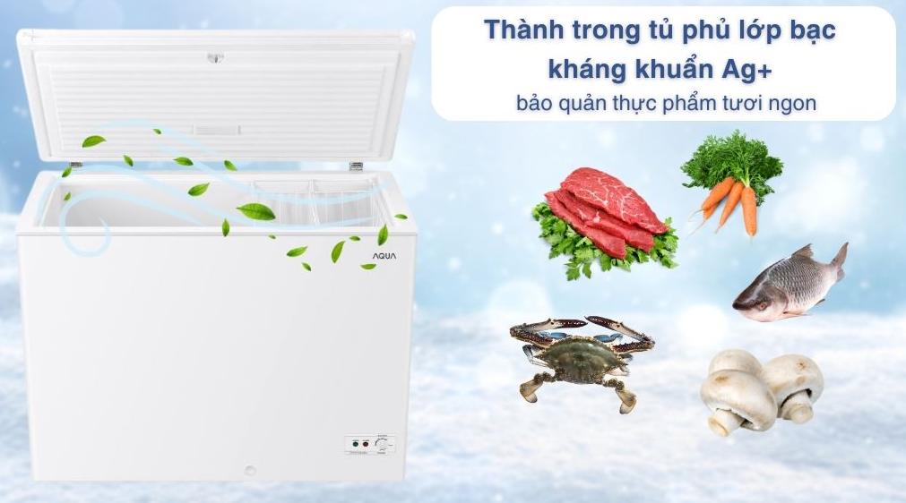 – Tủ đông Aqua AQF-C4001EN được trang bị lớp phủ bạc Ag+ trên thành trong tủ, giúp kháng khuẩn hiệu quả, ngăn ngừa sự phát triển của vi khuẩn và nấm mốc trong môi trường lạnh ẩm. Công nghệ này không chỉ hỗ trợ duy trì vệ sinh bên trong khoang tủ mà còn góp phần giữ thực phẩm tươi sạch và an toàn hơn trong suốt quá trình bảo quản dài ngày.